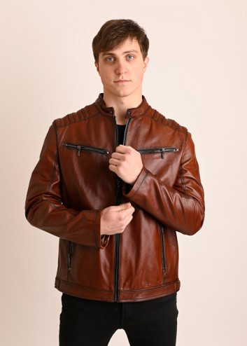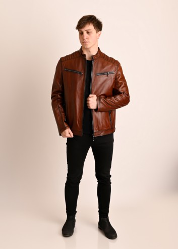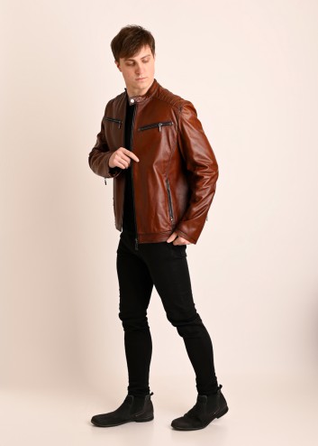 Męska kurtka skórzana o klasycznym kroju. Uszyta z miękkiej, naturalnej skóry w kolorze koniakowym z opalanymi szwami.