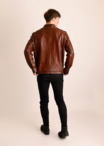Męska kurtka skórzana o klasycznym kroju. Uszyta z miękkiej, naturalnej skóry w kolorze whisky z opalanymi na czarno szwami.