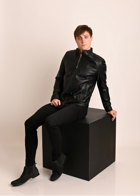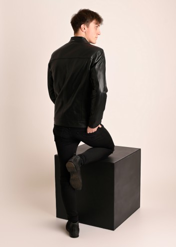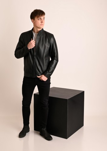Męska kurtka skórzana o eleganckim kroju. Uszyta z miękkiej, naturalnej skóry w kolorze czarnym.