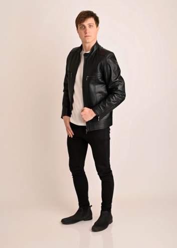 Męska kurtka skórzana o sportowym kroju. Uszyta z miękkiej, naturalnej skóry w kolorze czarnym.