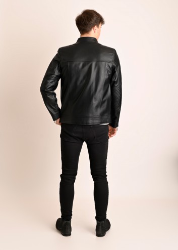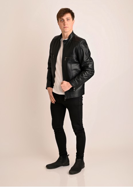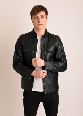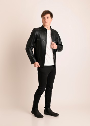 Męska kurtka skórzana o eleganckim kroju. Uszyta z miękkiej, naturalnej skóry w kolorze czarnym.