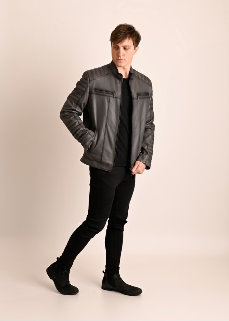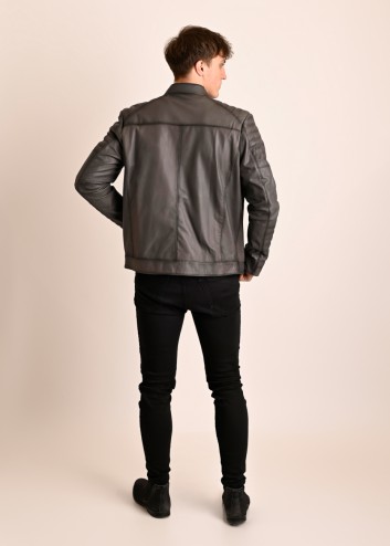 Męska kurtka skórzana o klasycznym kroju. Uszyta z miękkiej, naturalnej skóry w kolorze szarym z opalanymi szwami.