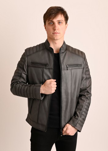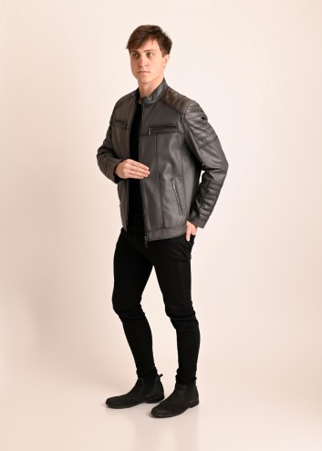 Męska kurtka skórzana o sportowym kroju. Uszyta z miękkiej, naturalnej skóry w kolorze popielatym.
