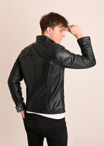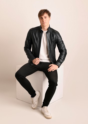 Męska kurtka skórzana o eleganckim kroju. Uszyta z miękkiej, naturalnej skóry w kolorze czarnym.